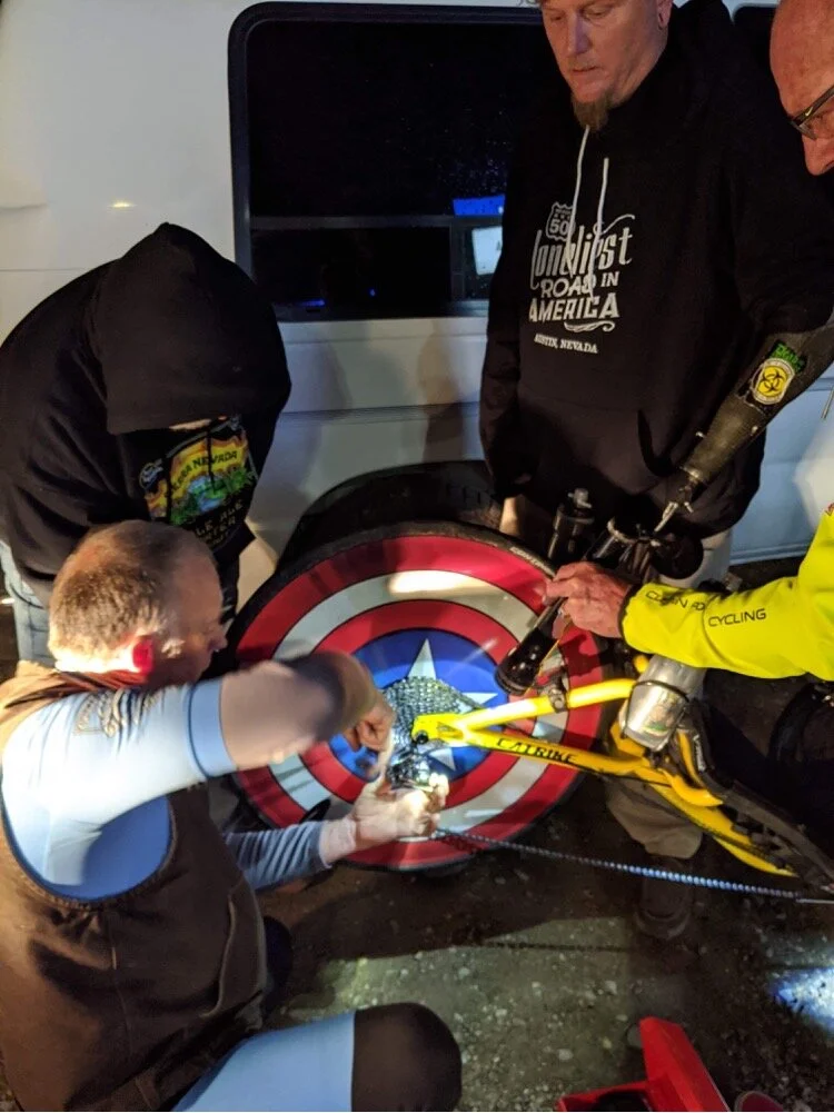 So, our team stopped in Austin to help team Rusty Dogs of War, a solo recumbent rider who was also a war veteran who had a serious mechanical issue that prevented him from completing the race. I was asleep at the time, but Crewman Jim later told me that Rich fixed not only his chain but derailleur.